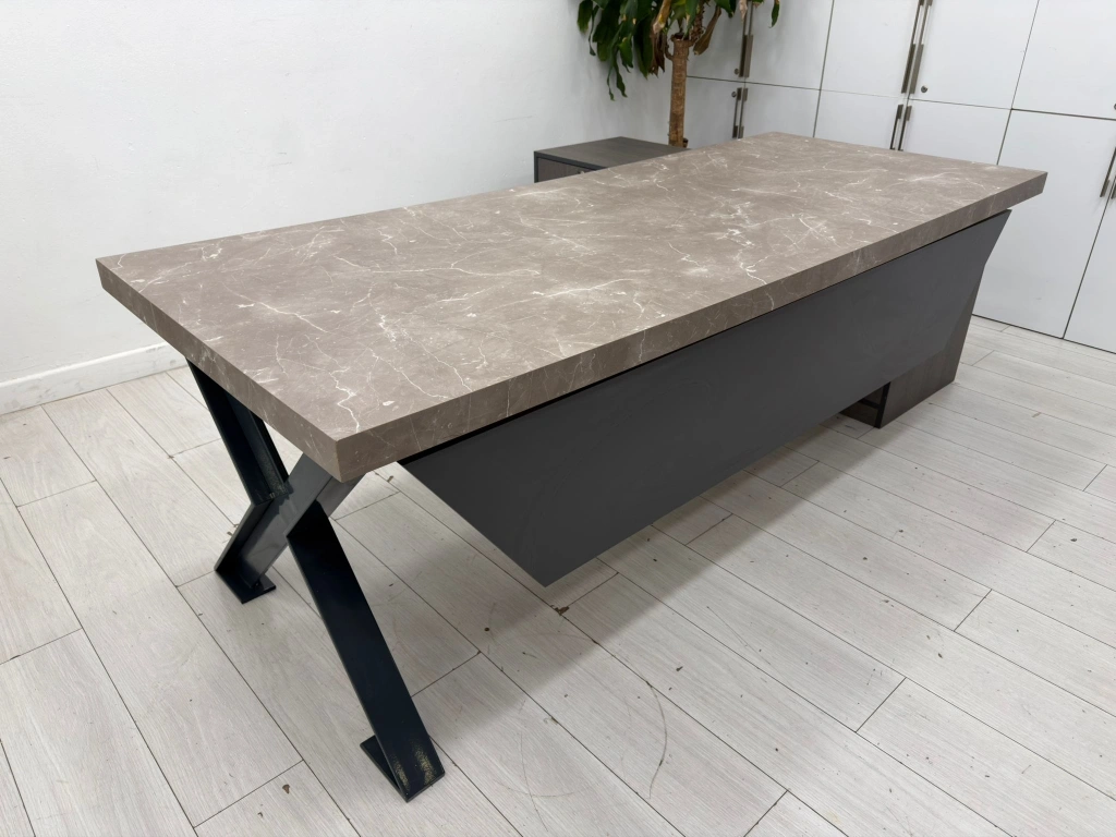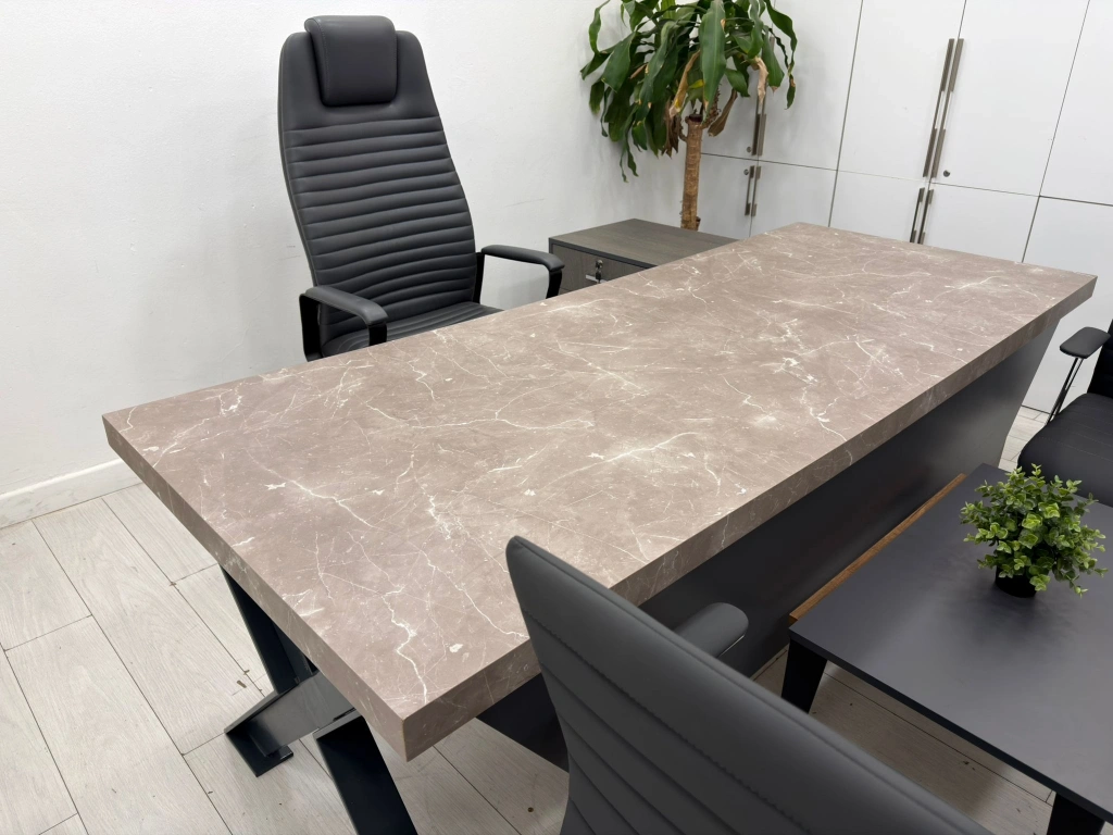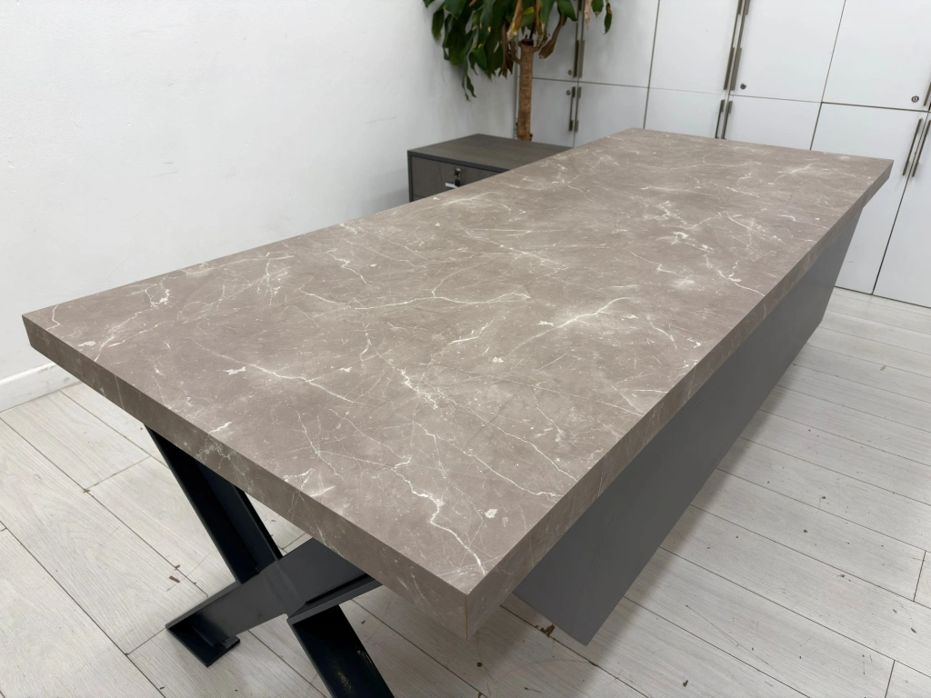 Mermer görünümlü etajerli yönetici çalışma masası, ofis, toplantı ve ortak çalışma alanlarında kullanıma uygun ikinci el bir seçenektir. Ürün, 270X170X75 ölçüsü, mermer görünümlü yüzeyi ile öne çıkar. Çalışma düzeni, toplantı akışı veya yan kullanım alanı oluşturmak için rahatlıkla değerlendirilebilir. Ürün kodu M4517 olarak kayıt altına alınmıştır.